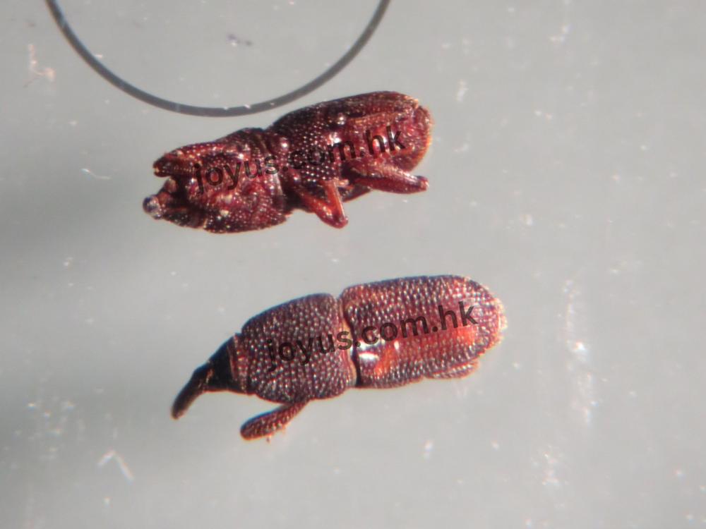 Weevil are about 3-mm long dark reddish brown, with four pale spots on the upper surface. The granary weevil is slightly larger (4 mm), of the same body style and entirely dark chestnut-brown.